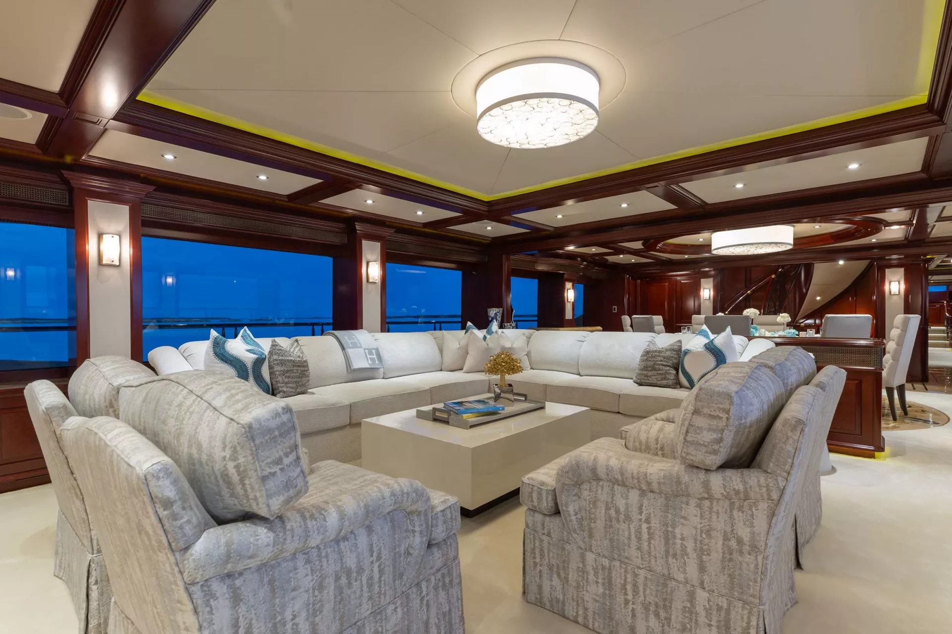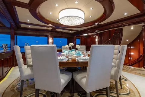 Forward of the main salon is the dining area with a formal dining table made of Pommele Sapele wood with Mahagony accents accommodating 10 guests.