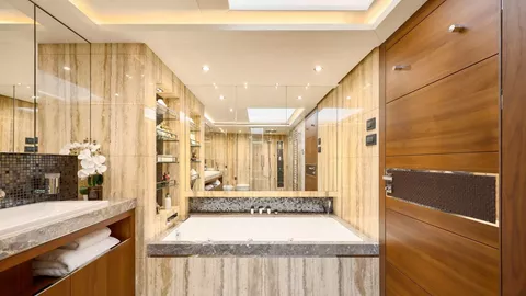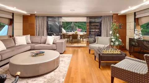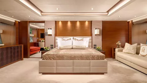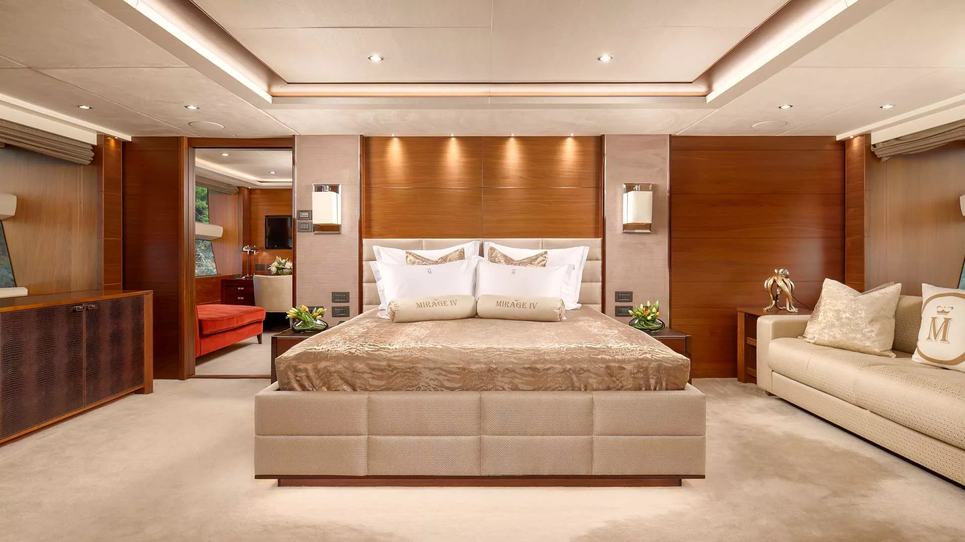 MIRAGE IV is a 40-meter Princess yacht that comfortably accommodates up to 12 guests across six luxurious staterooms. The expansive master suite, situated at the bow on the main deck, spans the full beam of the yacht. This opulent suite features a private office, ample storage space, separate wardrobes for him and her, and an en-suite bathroom equipped with a walk-in shower, ensuring a serene and indulgent stay on board.