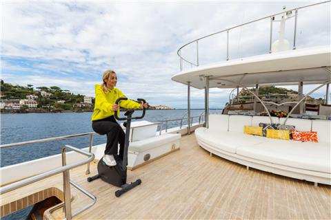 Nafisa boasts very ample open spaces, offering a variety of different seating and lounging areas: on the fly bridge, two huge sofas, an al fresco dining area and a fantastic 4 seats Jacuzzi to relax while admiring the breathtaking views of the Mediterranean landscapes. On the main deck Nafisa hosts a huge salon, a beautiful relax area at stern with a coffee table and sofas and a beautiful solarium on the foredeck. She also boasts a full gym equipment with stationary bike, stepper, yoga mat, weights, kettlebell, elastics, resistance band.