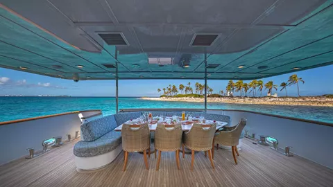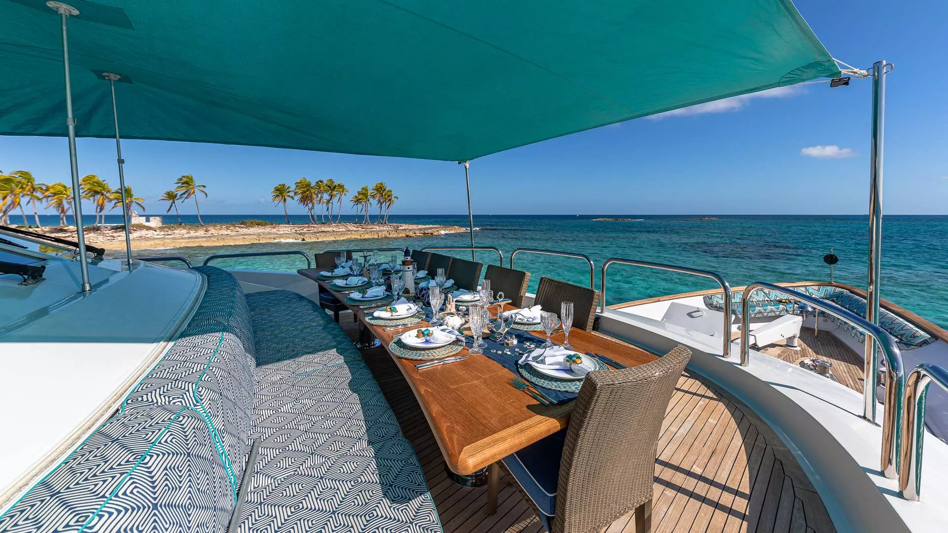 BRIDGE DECK AFT: Full sun, but with the ability to create shade with optional sun shade sail triangles. Al fresco dining for 10, chaise lounges, access to sun deck or walk-around to Portuguese Bridge.