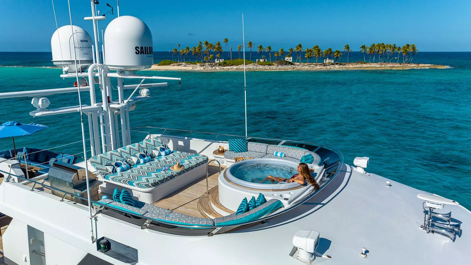 SUN DECK: Full sun, but with the ability to create shade with optional sun shade sail triangles Port and Starboard settee seating. 6-8 person Jacuzzi, and sun pads.