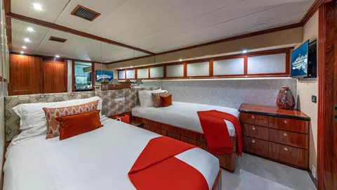 6th Guest Stateroom: One Single bed with adjacent bunk bed to accommodate children or staff. Hanging locker and drawers, 36� HDTV with individual satellite receiver. This stateroom shares the en-suite bathroom with the Port side King/Twin Convertible Guest Stateroom.