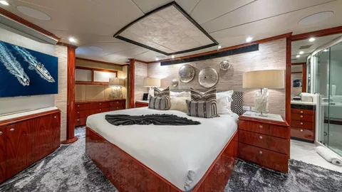 MASTER STATEROOM: Lower Deck, amidships. Full beam Stateroom with walk-around Sleep Number� King bed,mini-refrigerator, desk, and settee. Separate His-and Hers en-suite amenities featuring: Jacuzzi tub with overhead shower, sink, head, walk-in closet, and vanity dresser for Her; Steam shower with bench seat, head, sink, and walk-in closet for Him. Entertainment system featuring Bose surround sound, 60�HDTV with individual satellite receiver, and iPod docking station. Port holes in the master stateroom as well as his-and-her en-suite create abundant natural light if desired. Complete blackout option also available.