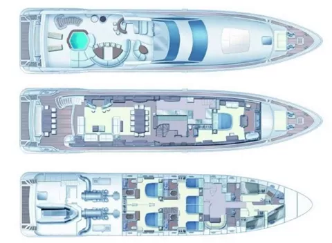 Top Deck: Large dining table with settee seating up to 10 under 2 retractable sunroofs, custom Jacuzzi spa, full wet bar, sunpads and aft lounges.