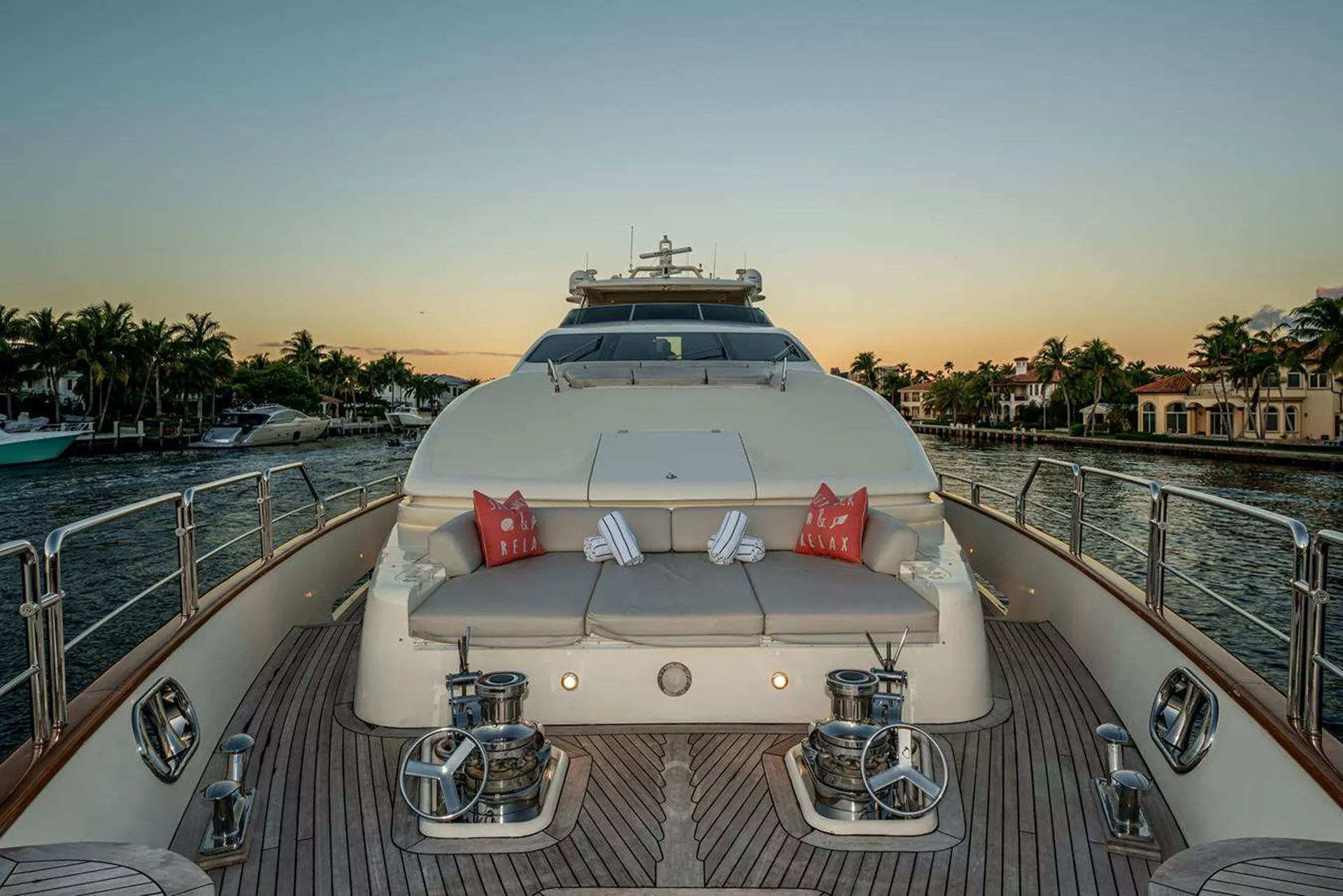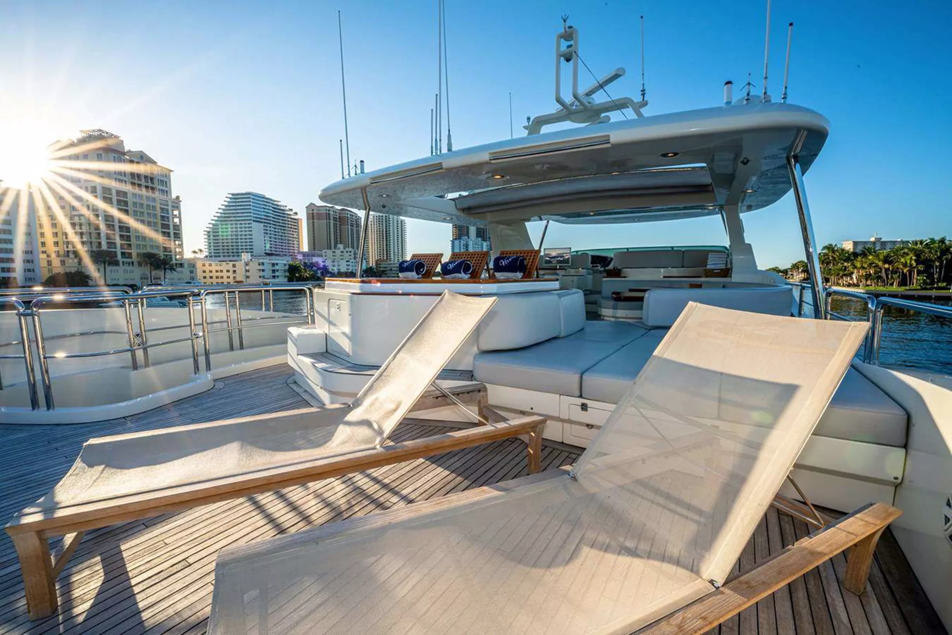 Experience the breathtaking views of Florida, the Bahamas, and New England from the numerous outdoor living spaces onboard. Take a stroll on the full walk-around deck with its high bow and relax on the upper and lower sun pads. The aft deck is perfect for entertaining, featuring a wet bar and casual dining area that can seat up to 12 guests.
