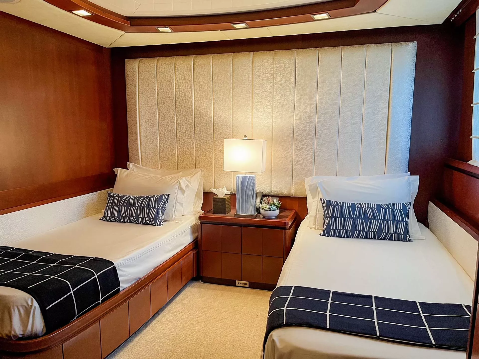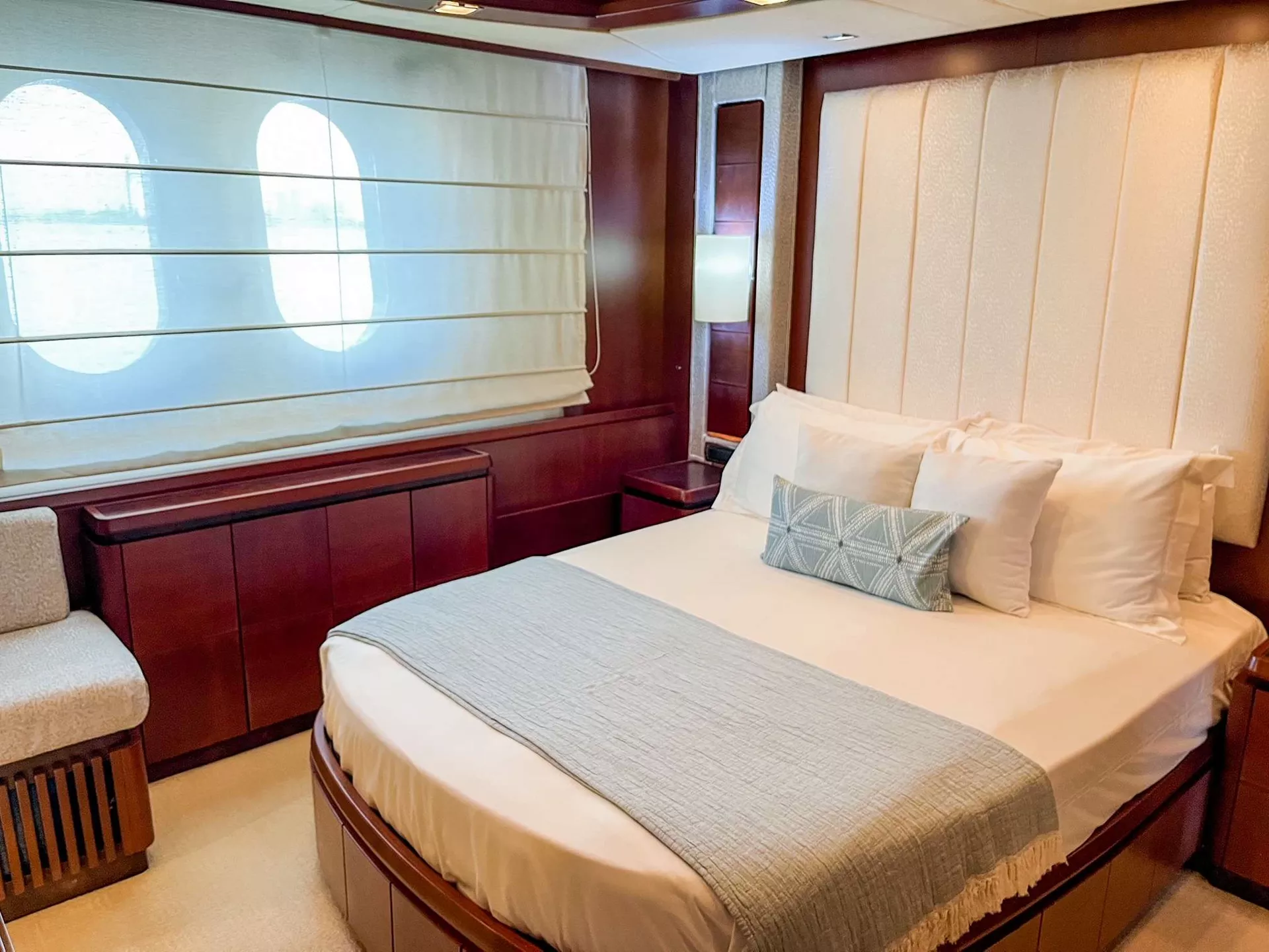 The main salon boasts large windows, light carpets, neutral furnishings, and cherry wood creating a luxurious and classic atmosphere. Relax in the full bar area, sofa, armchairs, ottomans, and entertainment center. The formal dining area is situated just forward with seating for up to 12 guests.