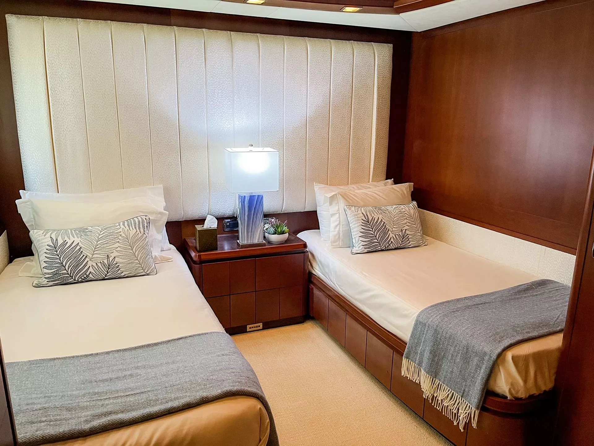 Retreat to the full beam master stateroom located forward on the main deck, featuring large windows, an ensuite with beautiful marble, large Jacuzzi tub, and jet shower. Below deck, you will find two cabins with a queen bed in each and a desk, and two cabins fitted with 2 twin beds in each. Each cabin has its own ensuite, TV, and plenty of closet space.