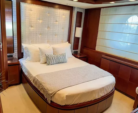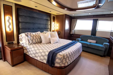 Spacious Main Salon with full bar area and entertainment center, formal dining forward seating up to 10 guests with custom glass panels. Main Deck: full walk-around to large high bow with upper and lower sunpads, aft deck seating for 10 w/ wet bar and TV. Master King forward on Main deck with large windows, ensuite marble bathroom, Jacuzzi tub, separate shower.