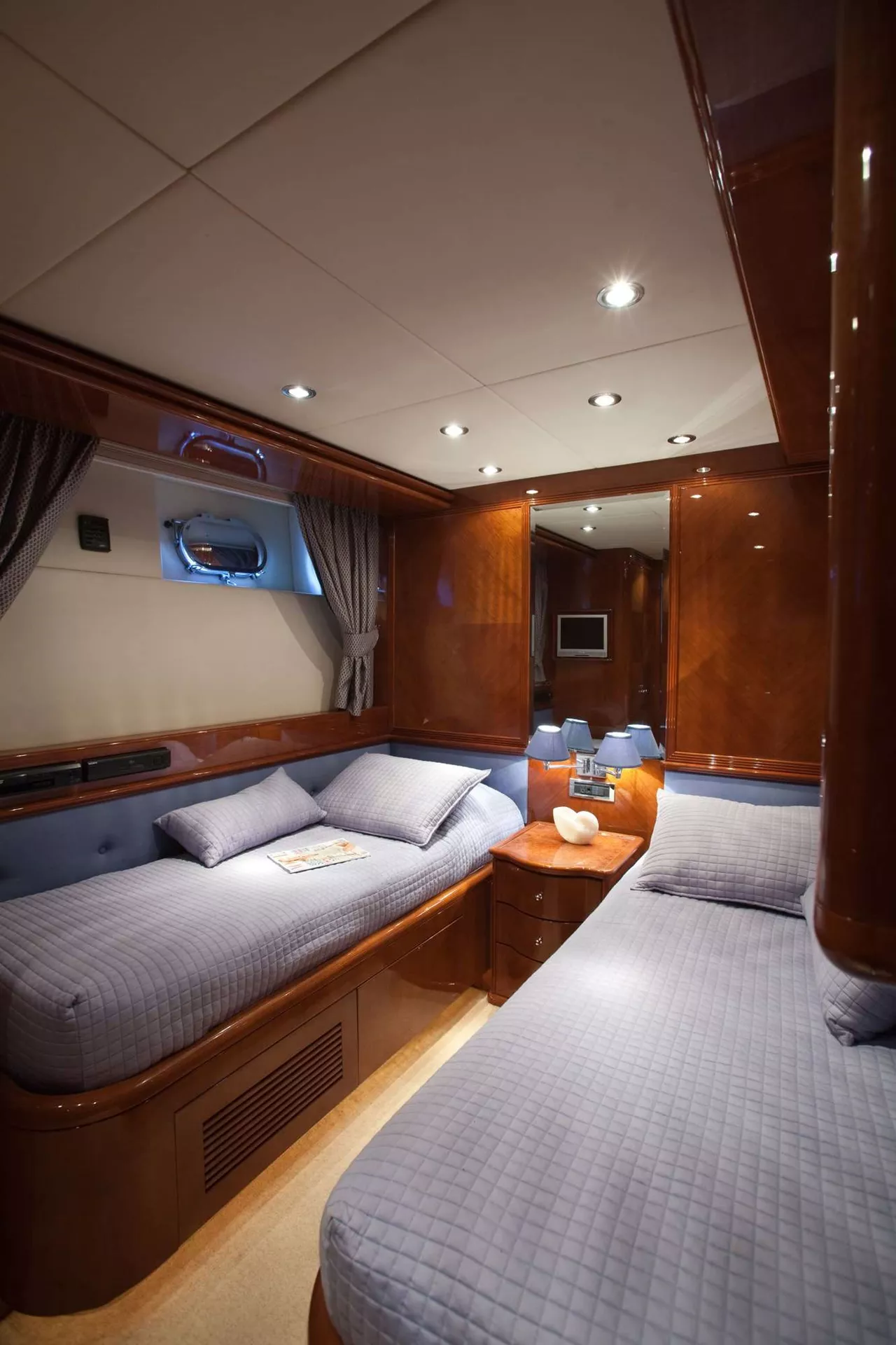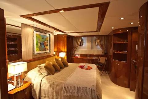 Master on mid deck below, 1 twin cabin can be converted to double cabin, 2 twin cabins with pullmans, and TV room on main deck can also be converted into a double cabin with ensuite.