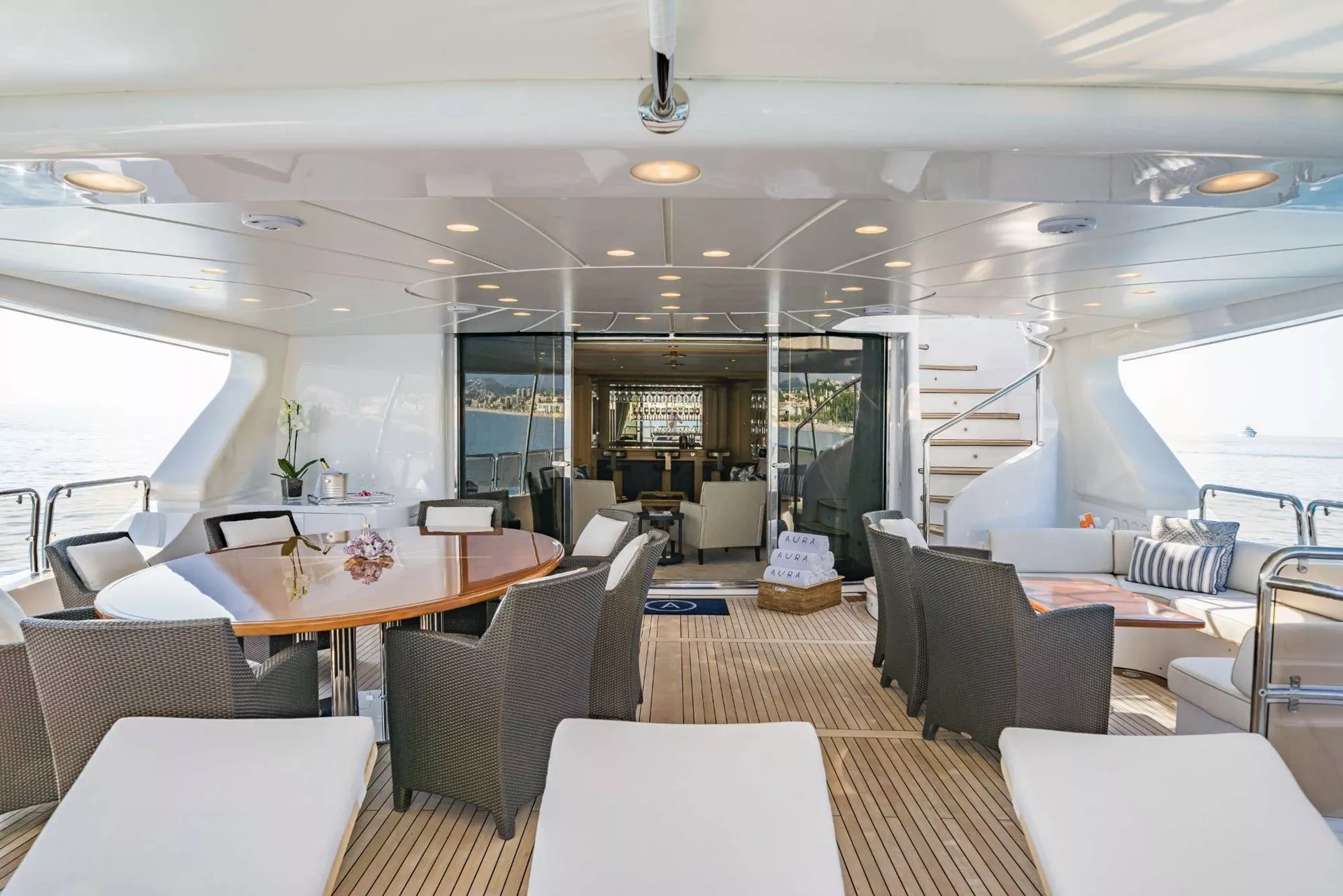 For those who prefer to be outside, AURA offers ultimate luxury in cool comfort with al fresco dining, deck Jacuzzi and an array of exciting water toys for the more adventurous charterer!