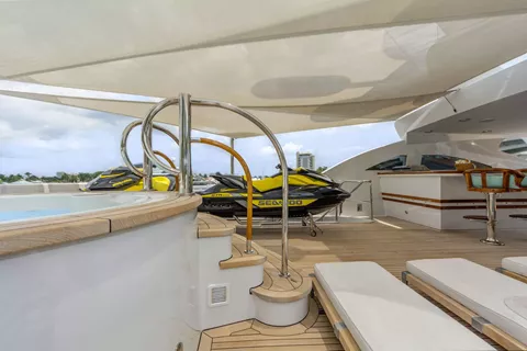 Built for entertaining; the sundeck Jacuzzi seats eight, wet bar is to port and an additional dining area is centerline; the perfect place to enjoy the fresh catch prepared on the sundeck grill. Forward is an al fresco seating area with built in sun lounge with loose furniture surrounding them.