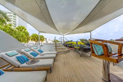 The sky lounge aft deck has a built-in wet bar and buffet, to port and starboard are varnished teak cocktail tables with loose furniture surrounding them. The focus of the Sky Deck is a beautiful varnished teak table that seats 10 guests. On the port side are stairs leading up to the sun deck.