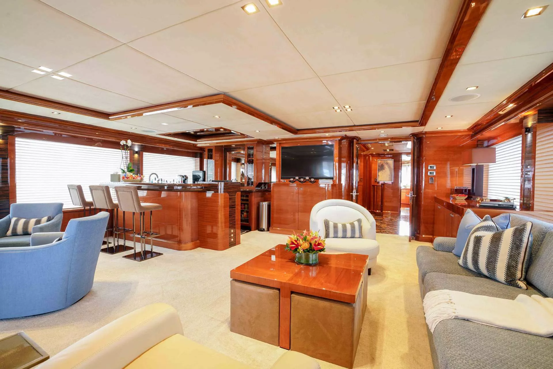 Moving forward from the aft deck through ASPEN ALTERNATIVE’s large, light and bright main salon with expansive windows and unobstructed views. The inviting main salon is comprised of couches and an assortment of loose furniture to comfortably accommodate a large party. Forward is the formal dining room which comfortably seating 10.