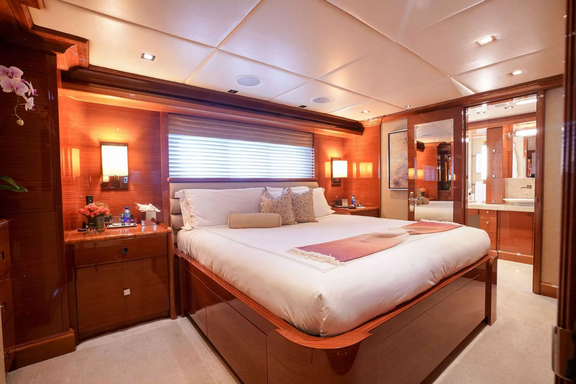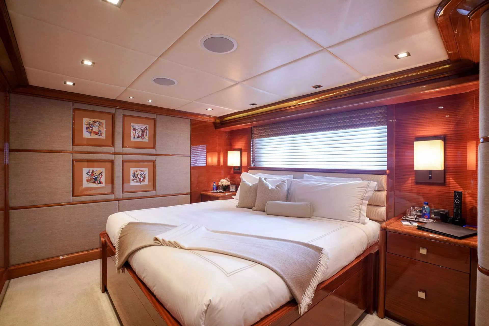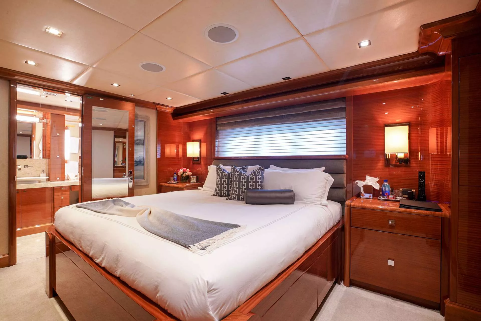 Down the spiral staircase from the main deck foyer there are four spacious guest staterooms all with ensuites. Aft there are two mirrored King size guest suites. Forward to port there is spacious double Twin suite and to starboard there is another King suite. All guest suites are finished to the same high standard as the Owner’s suite with state-of-the-art entertainment system.