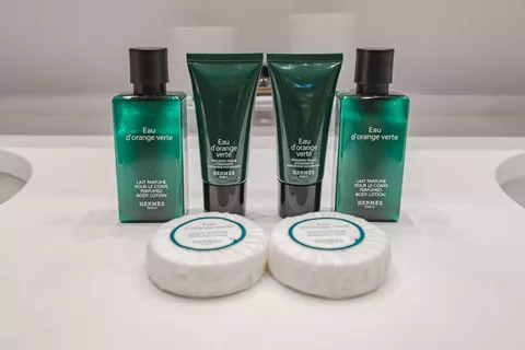 Each cabin is equipped with L'Occitane toiletries, a hair dryer, bathrobes, slippers, and a safe.