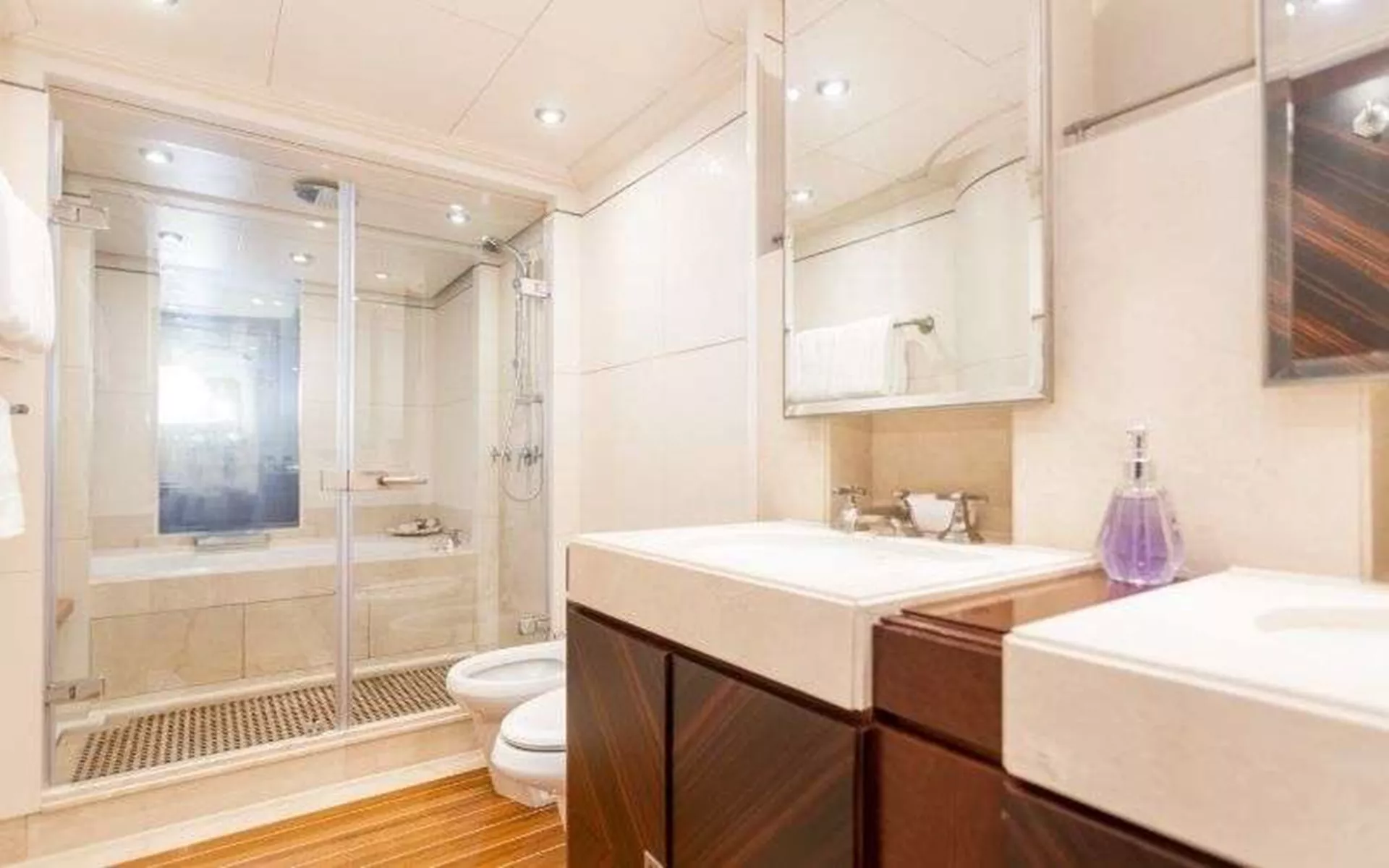 1 x Double Bed cabin with Pullman. Located to port side. Shares ensuite with the Twin Cabin. This cabin is most suitable for a couple, children, nannies, security, entourage etc.