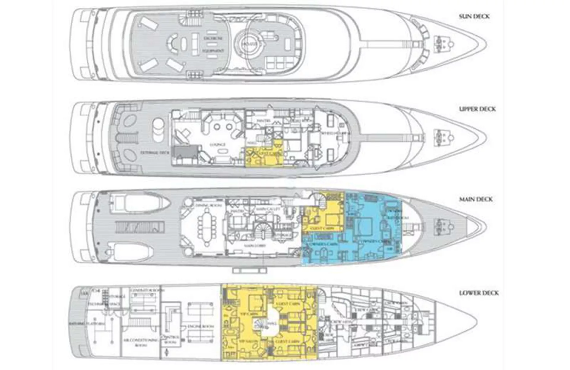 1 FULL BEAM MASTER, 1 FULL BEAM VIP, 1 DOUBLE CABIN, 2 TWIN CABINS, 2 PULLMAN BEDS