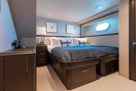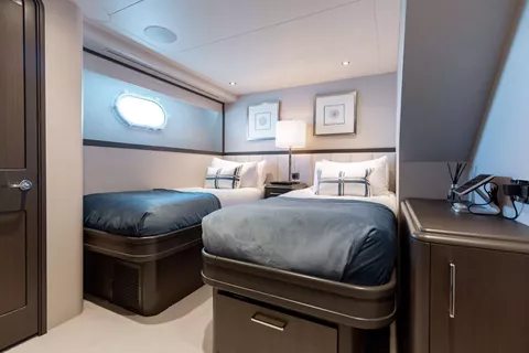Starboard Twin - convertible into a King bed, full hanging close, drawers, shower, single basin and larger counter space.