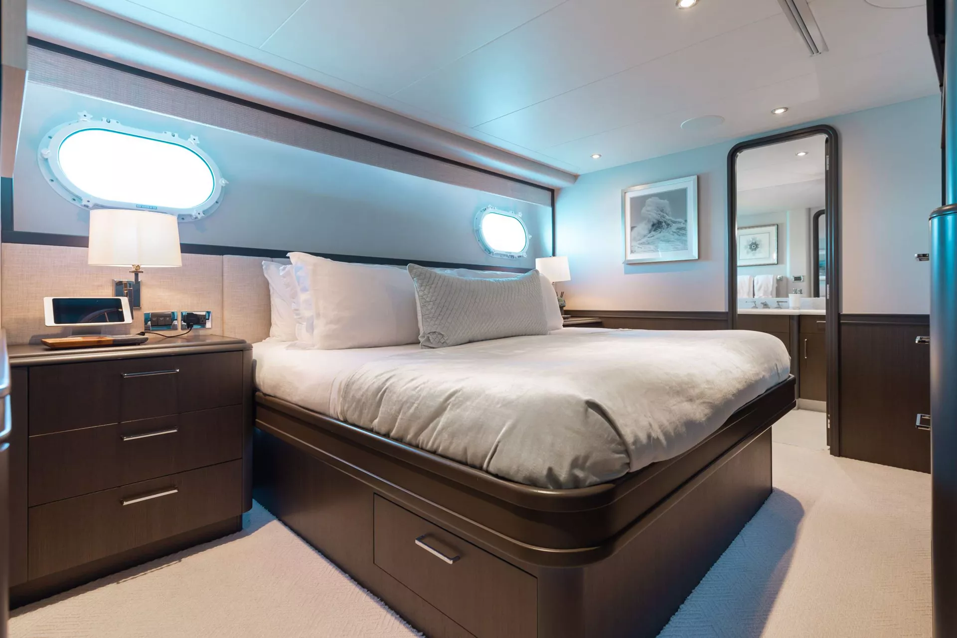 Master Stateroom - has center line California King bed, office on port side, Bench seat starboard side, separated toilets, with his/hers sinks. Waterfall shower, full hanging Closet and multiple storage drawers.
