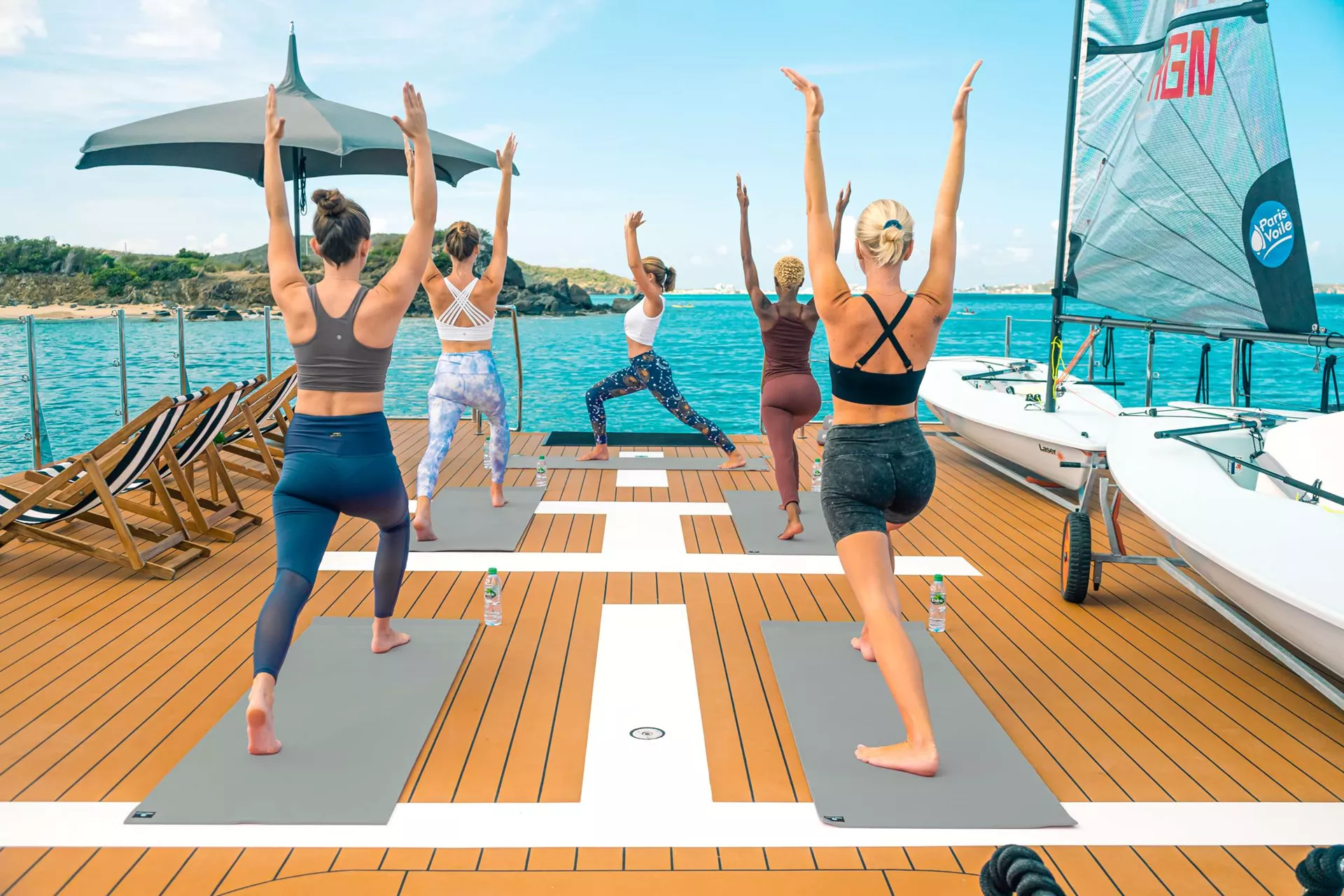 The bridge deck aft is used for al fresco dining around a rectangular table surrounded by a lounge seat and chairs. This area gives the guests a great vantage point to view the surrounding area and daily activities.