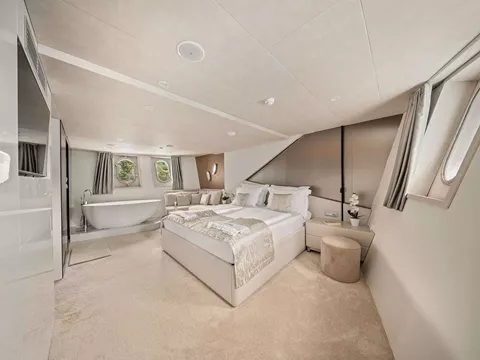 Master cabin with double bed. Private bathroom with shower box and home-type toilet.