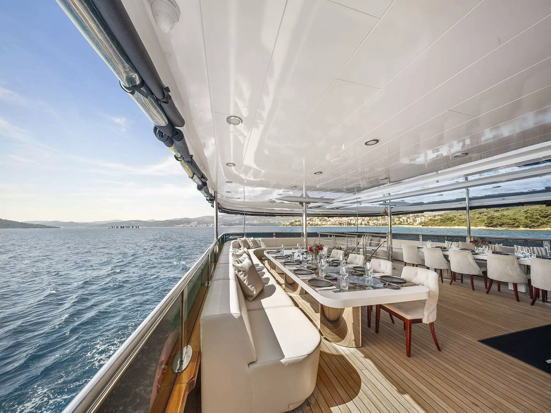 The newly renovated sundeck is the main retreat for all gatherings under the sun and stars. Brand new teak floors lie beneath the jacuzzi and a fully stocked white marble bar. Equipped with ample sunbathing chairs and a rainforest shower for pure comfort and relaxation. Make sure to connect to the Bluetooth speakers for personalized listening pleasure.