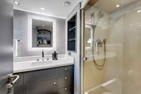 Guest Stateroom: Queen Bed, Ensuite bathroom with shower.