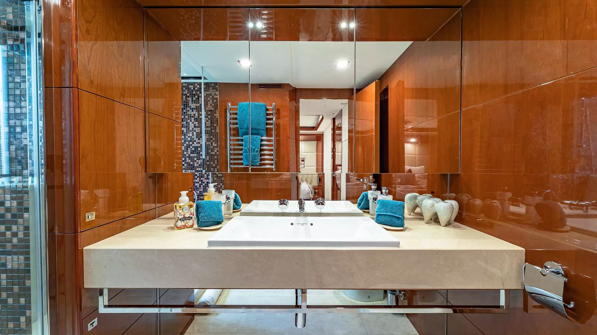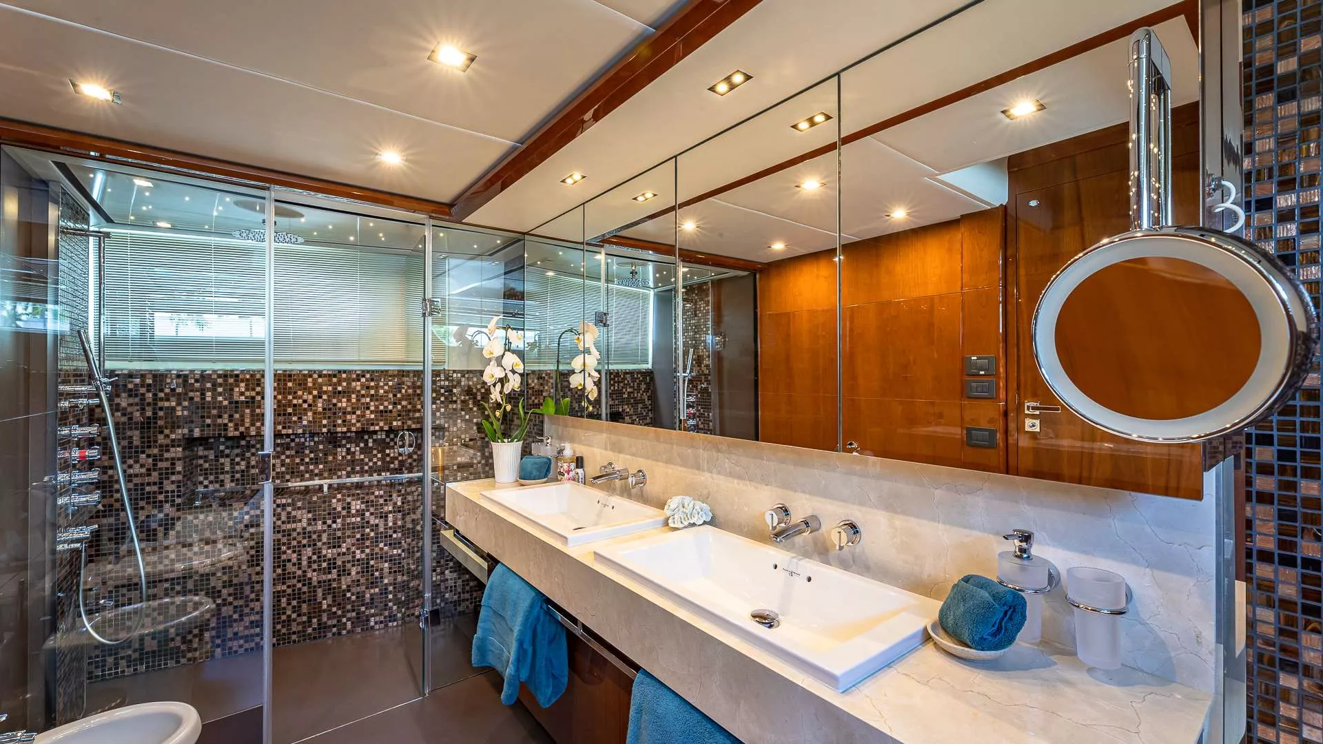 Forward on the lower deck, the twin cabin provides flexibility for families or friends, featuring two single berths, an entertainment system, and its own en-suite bathroom with a shower.