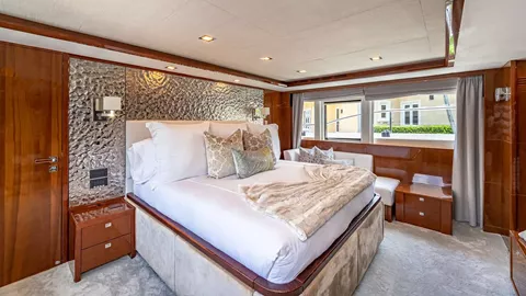Occupying a prime position forward on the main deck, the full-beam master suite is a sanctuary of light and space. Expansive panoramic windows frame sweeping ocean views, while a king-size bed, vanity desk, and ample wardrobe storage ensure complete comfort. The en-suite bathroom is finished in marble, with dual sinks, a walk-in rain shower, and a separate bathtub, creating a serene retreat for the principal guests.