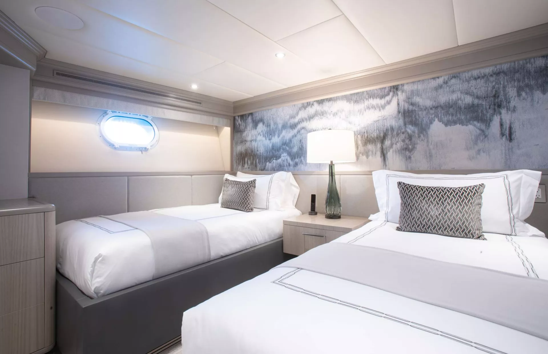 6 - Starboard Twin Stateroom - Lower Guest Area, Twin Bed / King Bed Conversion, Hanging Closet, Drawers, Single Toilet, Single Sink, Shower