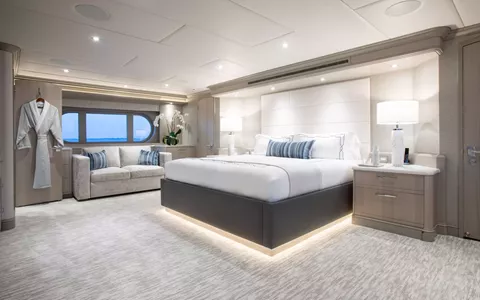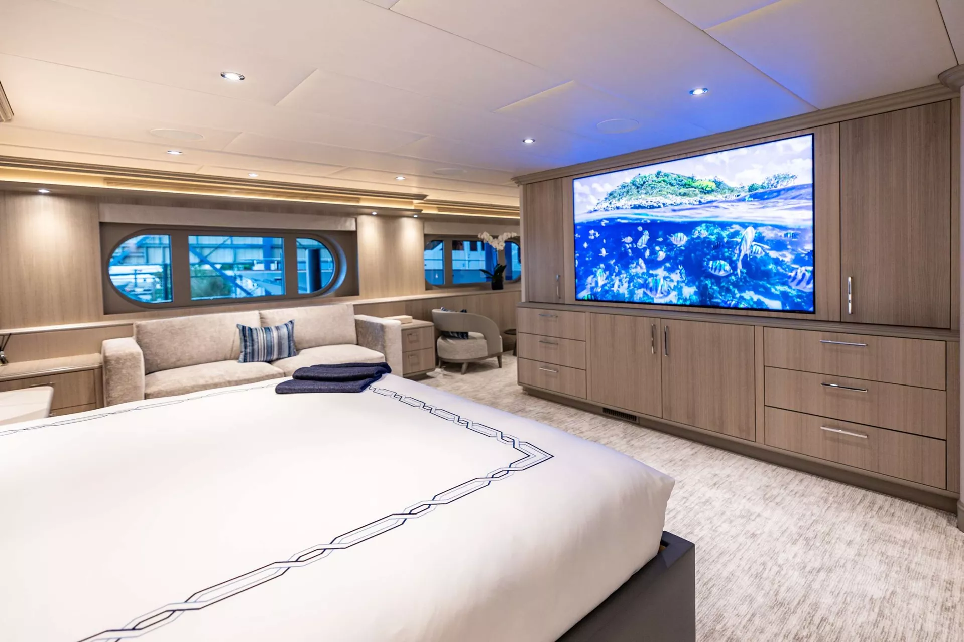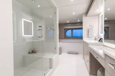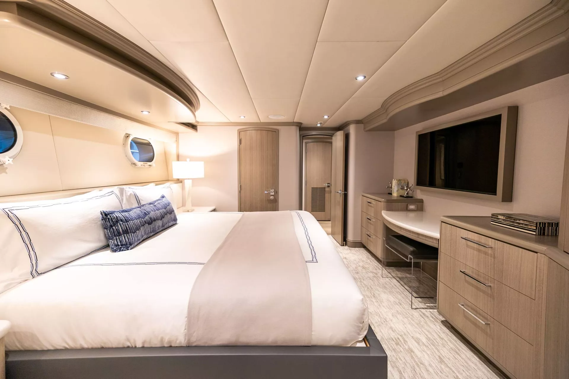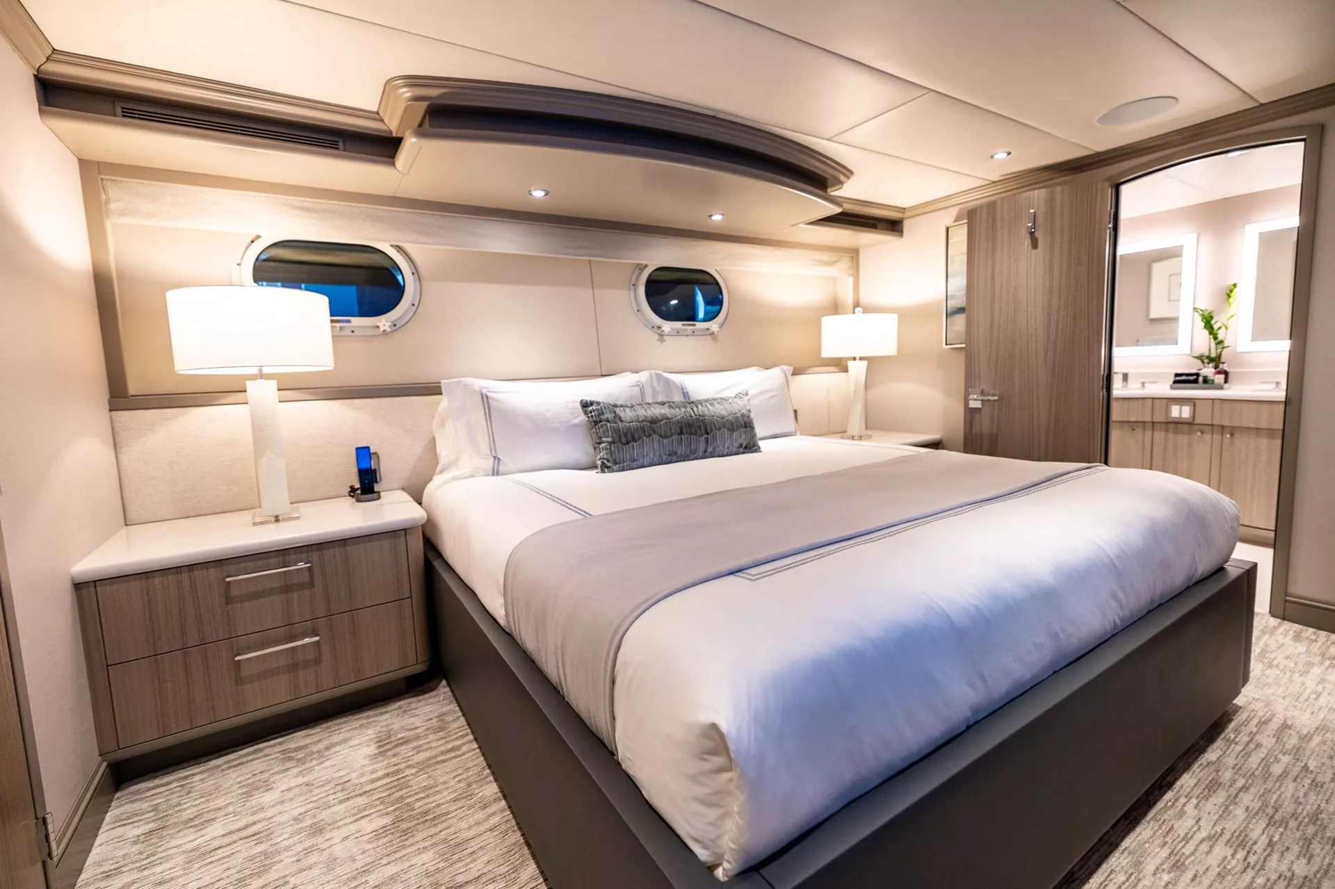 1- Master Stateroom - On Deck, Full Beam Stateroom, King Bed on Centerline, Office Area, Walk-In Closets - Drawers, Bathtub, His & Her Sinks, His & Her Toilets, Shower