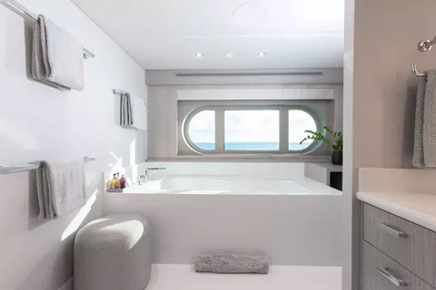 2 - VIP Stateroom - On Deck, Walkaround King Bed, Walk-in closet, Drawers, Single Toilet, Single Sink, Shower (King Bed converts into a Massage table)