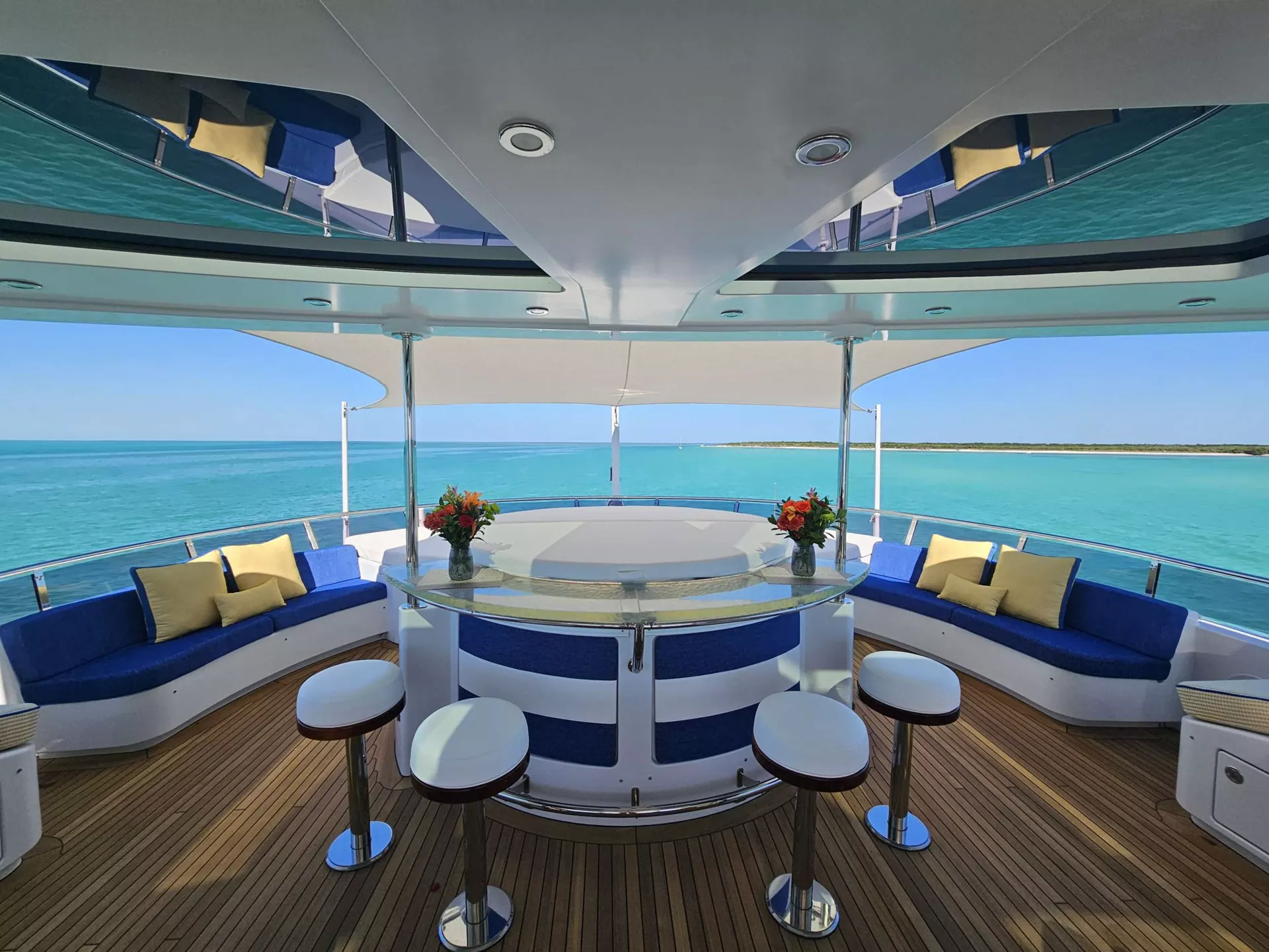 The hot tub spa w/jets is forward with a 180⁰ view, lovely bar top and stools, built in cushioned seating with back rests and sun pads. UV protected skylights provide shade over the seating area with sofa and two casual chairs and a hi/low table and a bar. There is a 45" TV for outdoor movies that raises from the cabinet partially protecting the seating area. There is also the convenience of a day head. When jet skis and water toys are removed, padded lounge chairs complete the sun deck area which also has a removable awning.