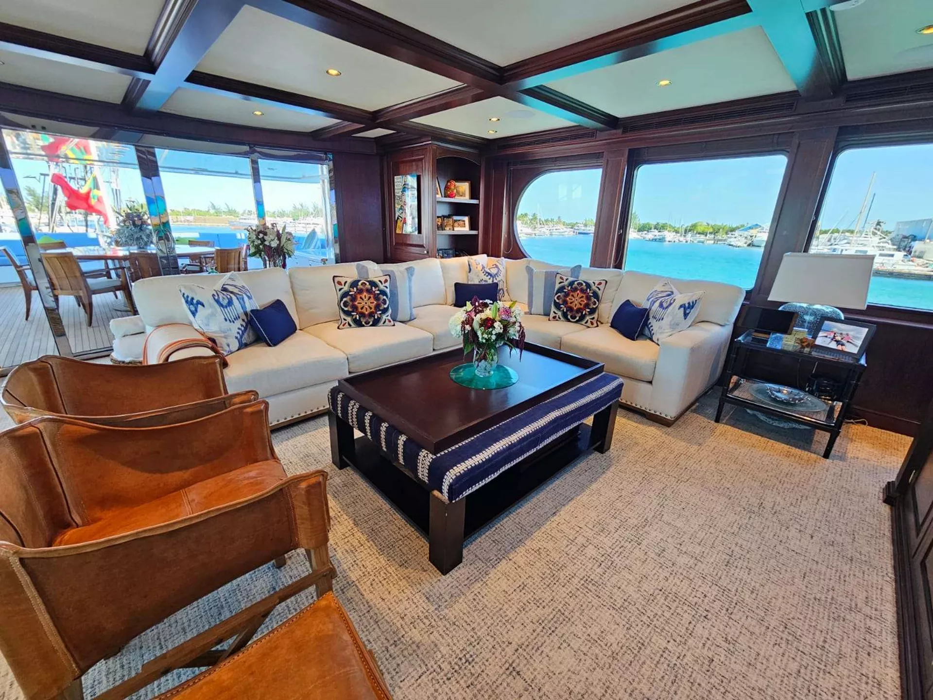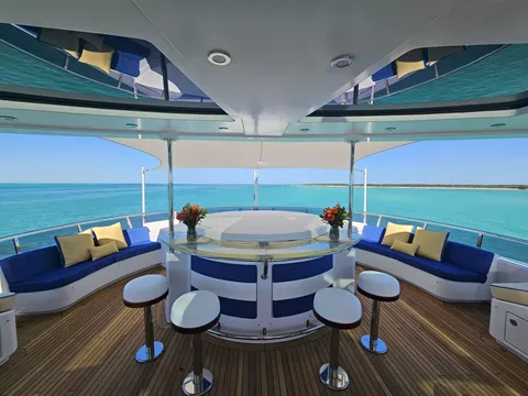 Covered aft deck with seating area, tables and lounge chairs and access to the swim platform. From the aft deck you will also enter the salon through double sliding glass doors. The salon provides plush seating for intimate conversation and enjoyment of the entertainment system and a 60' TV. Forward of the salon is the formal dining room with seating for 10 guest, followed by the foyer and entry to the galley and master stateroom.