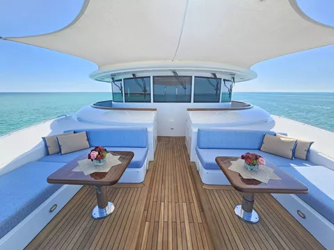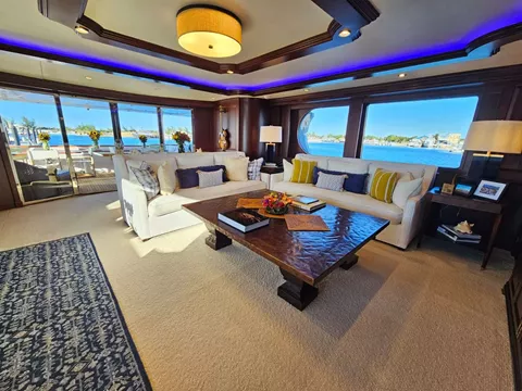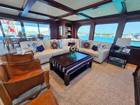 Forward of the wheel house is a delightful seating area with cushions and table. Shade is optional with a removable awning. From this area there is access to the bow or to the aft bridge deck that includes shade, a full bar, 32" TV, alfresco dining for 10 guests and additional built in casual seating and tables. The sky lounge includes a plush white sectional sofa, coffee table, 2 occasional chairs, entertainment center with 93" TV, a game table and chairs and powder room. The ceiling is accented with exposed mahogany beams. A day head is also on this level.