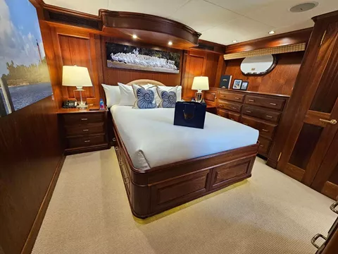 Main Deck Master Suite - King bed. The full beam master suite is accessible from the foyer through double, beveled glass doors to the master office with mahogany desk, office equipment and 20" TV. The adjoining stateroom has a Mahogany bed and cabinets, and two ensuite bathrooms. The bathrooms have sky-lights and Honey Onxy marble floors. His bathroom has a shower with Honey Onxy walls and glass enclosure while her bath has a hot tub w/jets, makeup area and ottoman. There are large windows, two walk-in dressing rooms and an entertainment center with a 30' TV.