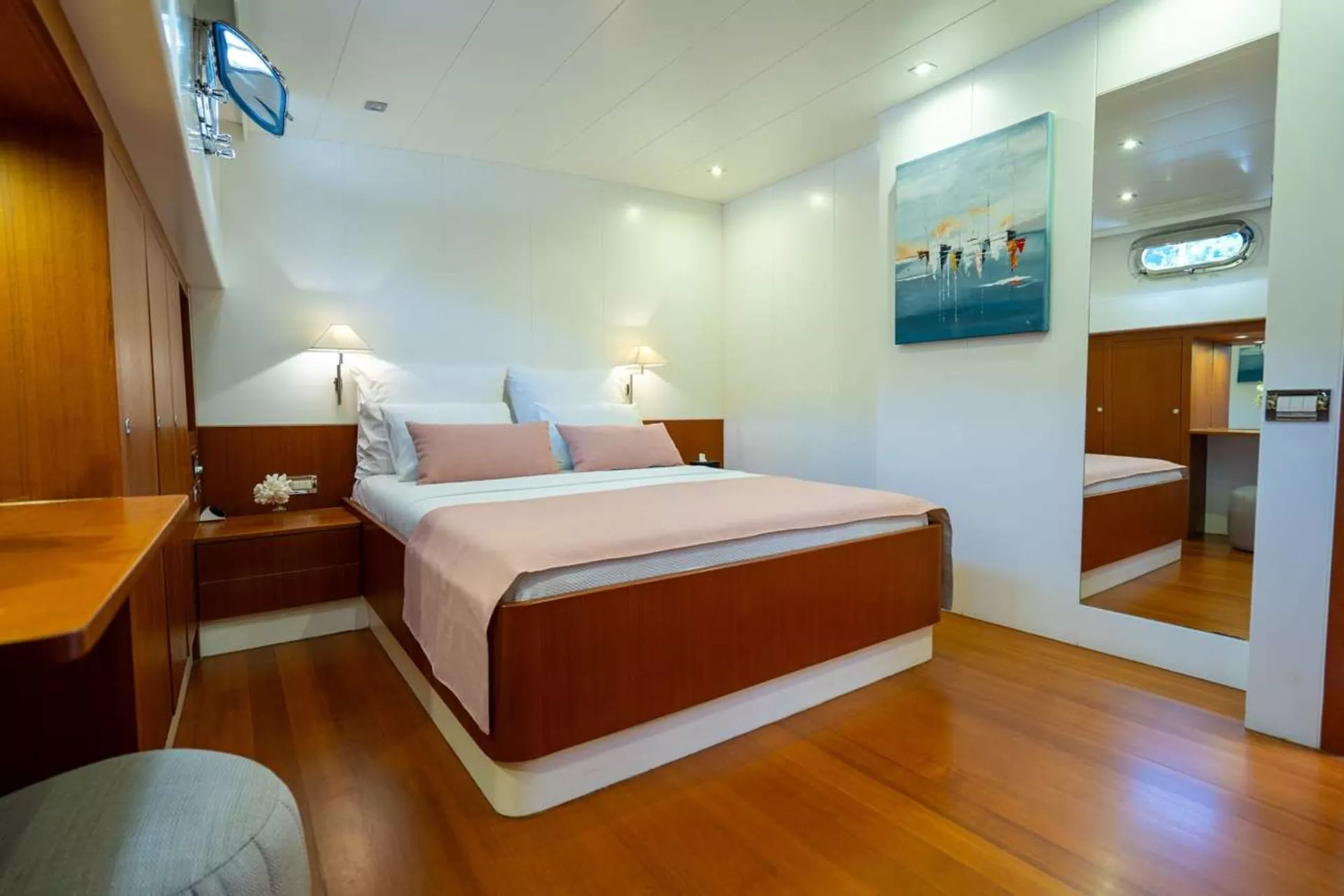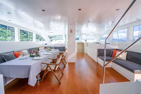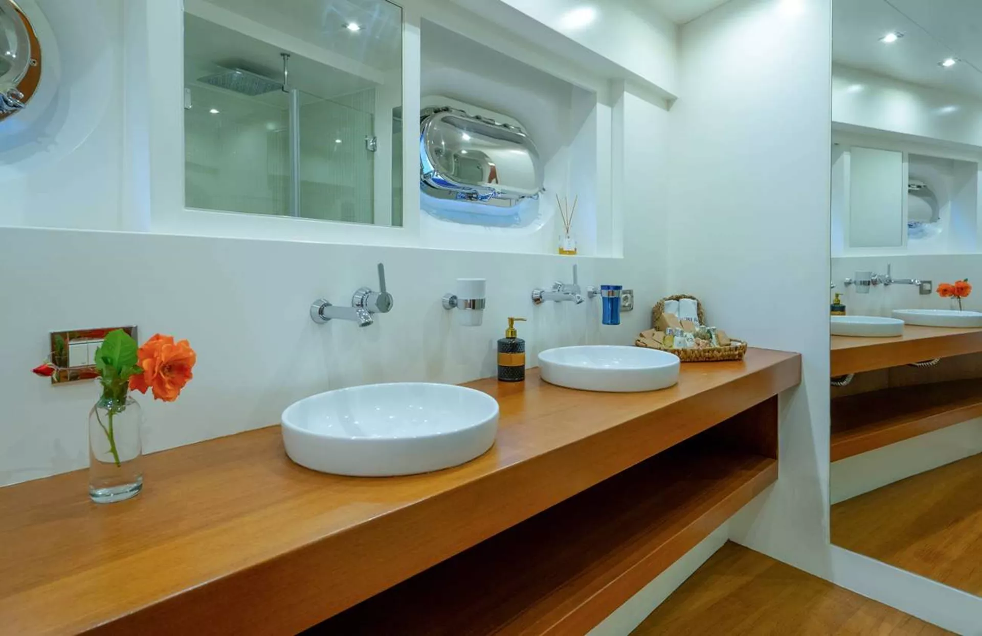 Ubi Bene can accommodates 12 guests in 5 cabins. She has a light modern luxury interior which has been created using a combination of white and Burmese teak. The master cabin has a king bed, shower and head. She has a further 2 queen and 2 triple cabins each with shower and head. Each cabin has individually controlled air conditioning and heating and her crew have a separate companionway, heads and shower.