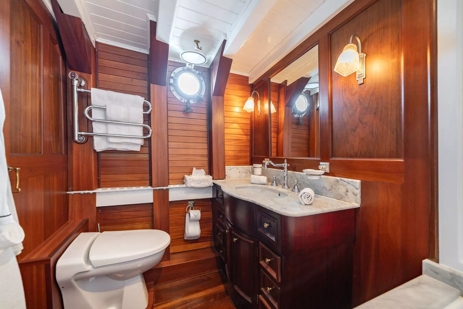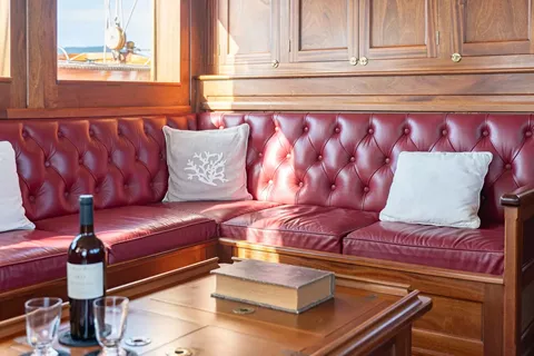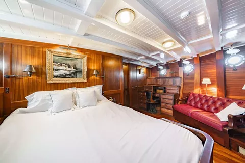 Built in 1927 by Wiener Werft, Trinakria is a legendary gaff-rigged schooner with a steel hull and wooden superstructure. She was entirely refitted by the current Captain over a 10 year period, from 2004 to 2014. Her engines were entirely rebuilt and her interiors have been returned to their former glory. The warm polished woods, classic white planked ceilings and crafted leather furnishings of Trinakria have appeared in a number of movies over the decades.
