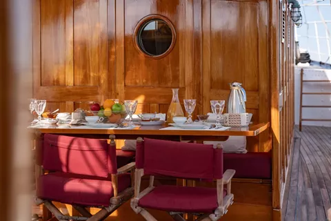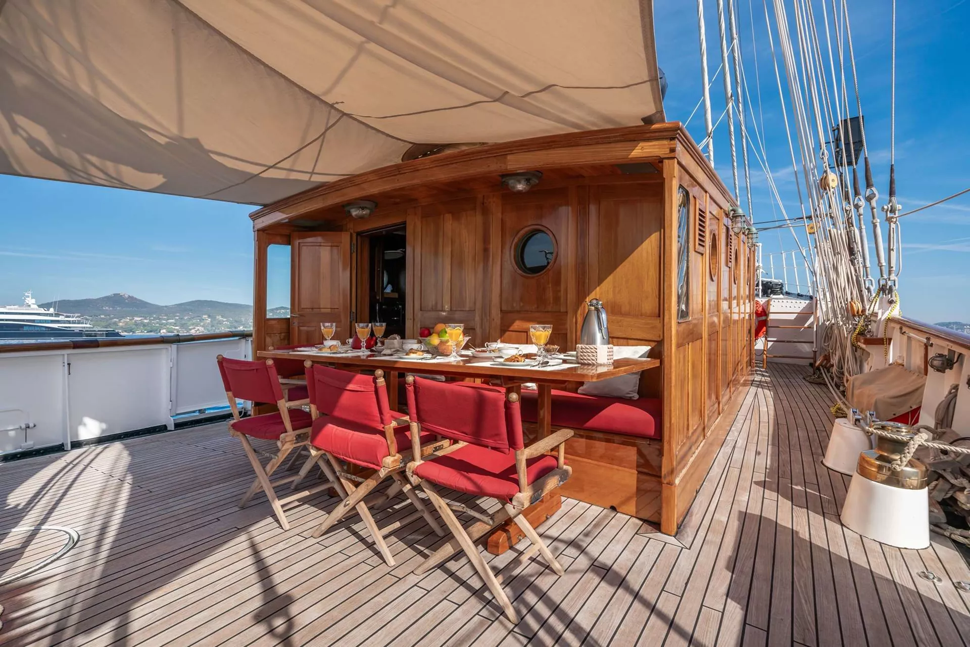 The aft deck also has additional seating available and is a very enjoyable, large deck to relax on for sundowners and dinner at anchor. Thanks to her relatively low draft, TRINAKRIA can also offer 'Turkish' mooring (stern lines to a tree or rocks) in the right waters.